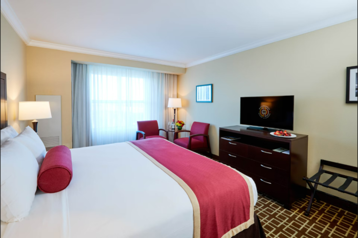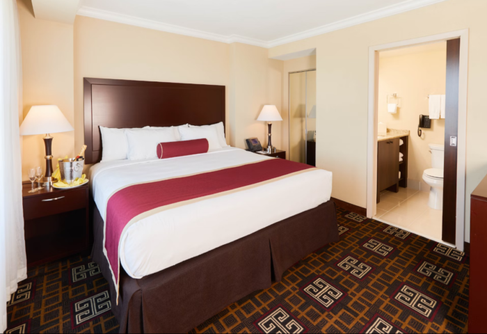 When a king bedroom is what you desire, this Deluxe Level room fits you perfectly. You’ll enjoy the ultramodern bathroom as well. Also includes two night tables and 42″ plasma TV.