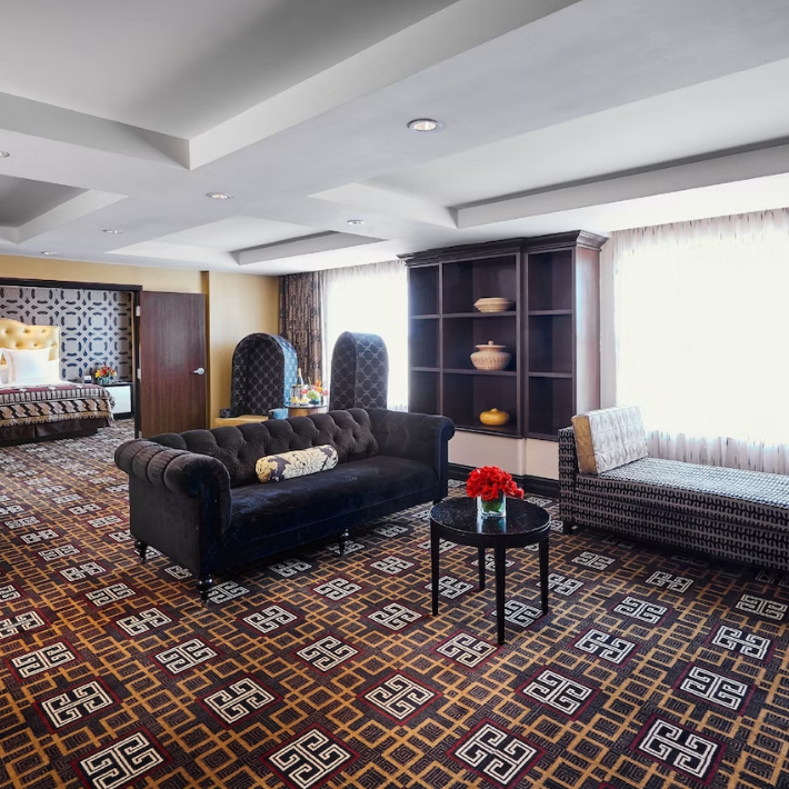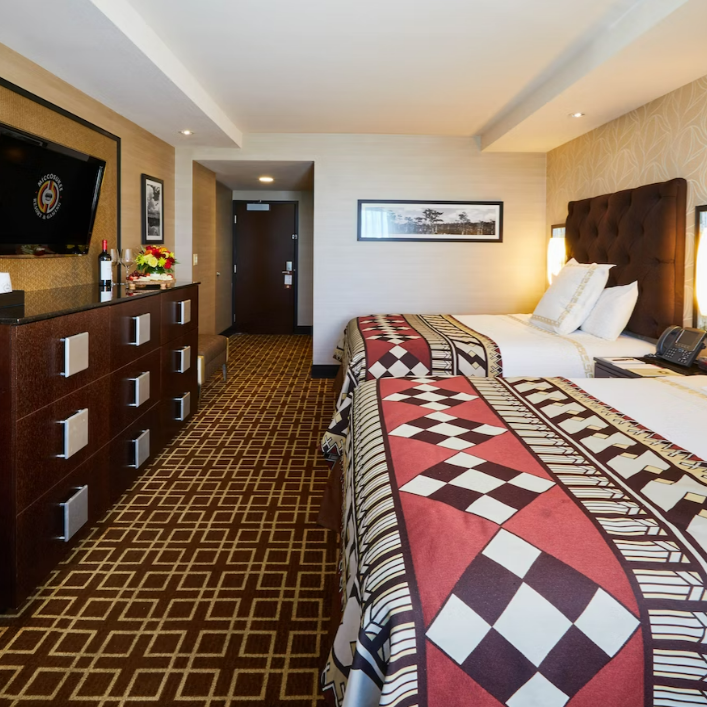Indulge in luxury with the Presidential Suite at Miccosukee Casino Resort. This lavish accommodation boasts a spacious living area and an expansive bedroom, furnished with two luxurious queen beds, a comfortable sleeper sofa, an elegant desk, a stylish coffee table, a set of relaxing lounge and activity chairs, as well as convenient amenities like a refrigerator and microwave, all designed to enhance your stay and provide you with the utmost comfort and sophistication.