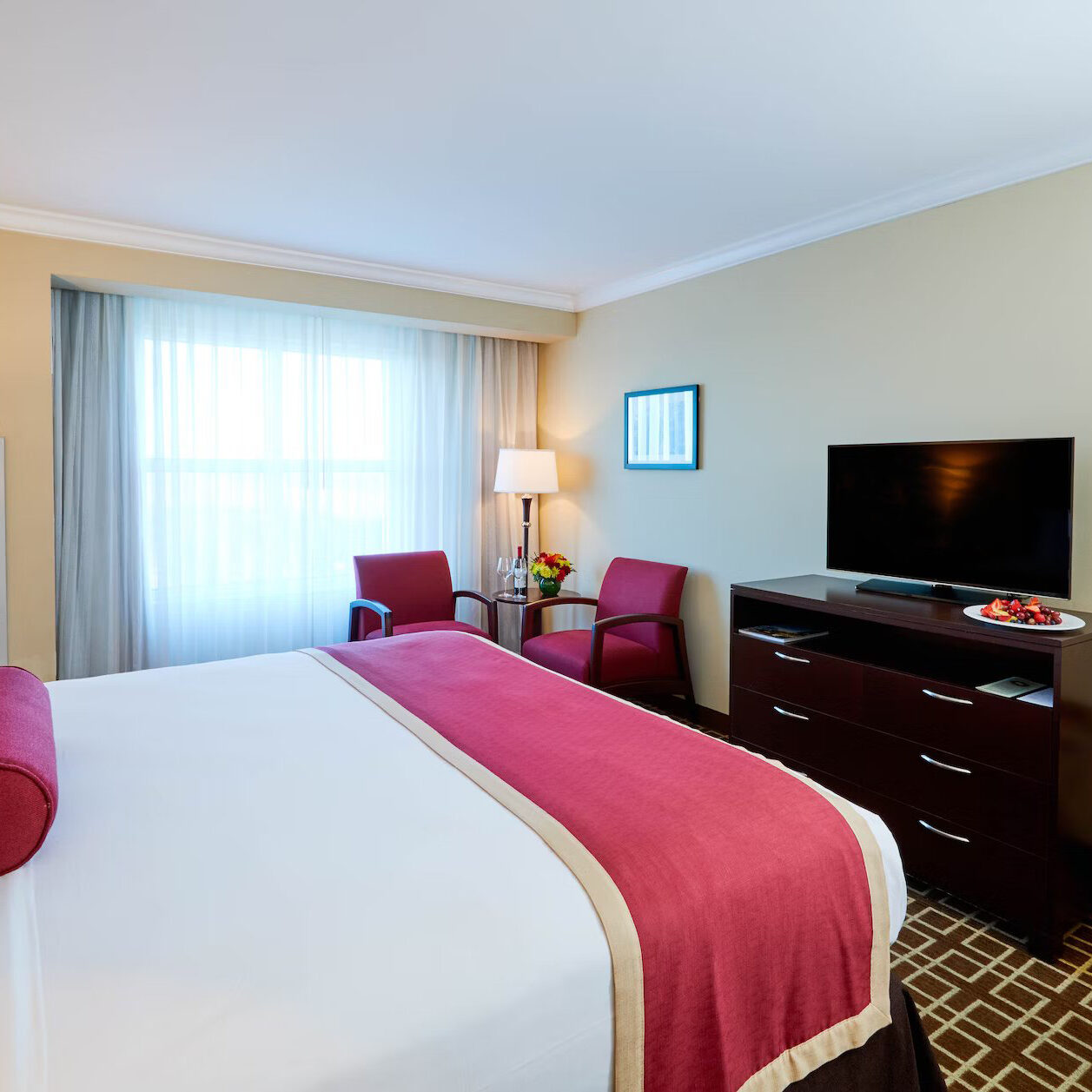 Perfect for a couple’s getaway, this spacious room features a luxurious king-size bed, a large bathroom with a separate vanity, and a 50" TV.